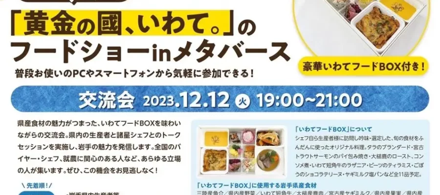 岩手県 岩手県は、メタバース(仮想空間)を活用した県産食材の販路開拓・拡大の取り組み「『黄金の國、いわて。』のフードショーinメタバース」を実施しています。9月に実施した生産者とバイヤーとの商談会に引き続き、12月12日…