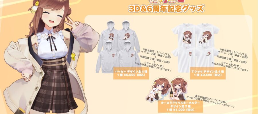 咲乃もこが7月7日にデビュー6周年を迎え、翌8日には自身の3Dビジュアルを初お披露目したことをうけ、3D&6周年記念グッズが発売開始となっている。受注盤賠償品となっており、7月21日23時59分までうけつけている。 グッ…