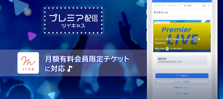 モイは2日、同社が運営するライブ配信プラットフォーム「ツイキャス」の有料オンラインライブ機能「プレミア配信」で、有料サブスク「メンバーシップ」メンバー限定チケットの販売機能を追加したことを発表した。 本機能により、メンバ…