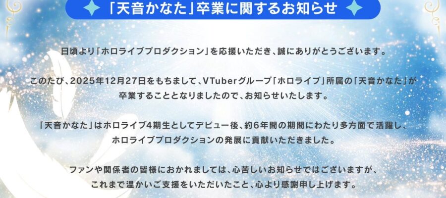 ホロライブに所属する天音かなたが、2025年12月27日(土)をもって卒業することをあきらかにした。 2日16時半に「17:00からお知らせ配信をする」とSNSに突然投稿し、約30分後にスタートした配信「今後の活動につい…