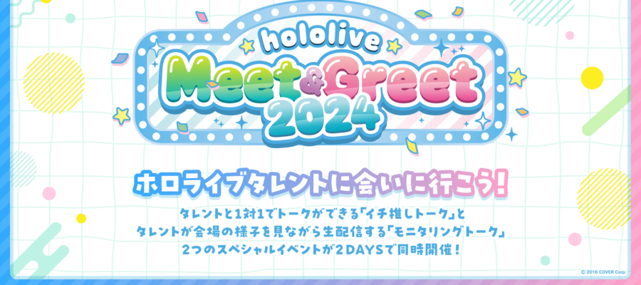 株式会社カバーが運営するプロダクション・ホロライブが、2024年9月15日(日)/16日(月・祝)に東京国際フォーラム ホールB7(東京都)にて、「hololive Meet&Greet 2024」を開催する。 …
