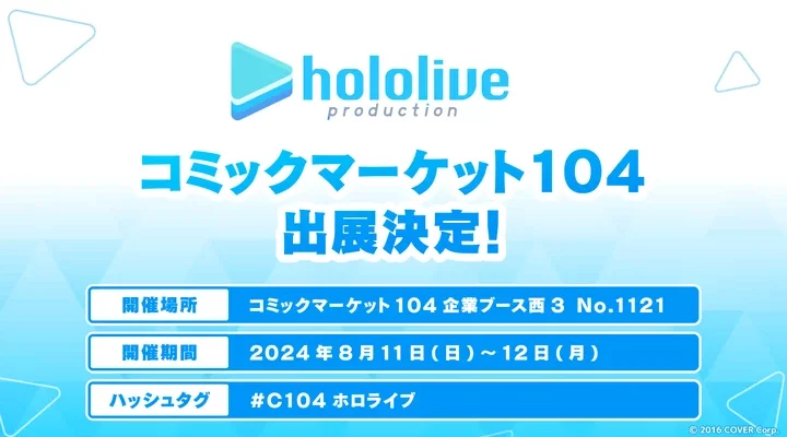 カバー株式会社 カバー株式会社(本社:東京都港区、代表取締役社長:谷郷元昭)は、弊社が運営するVTuber事務所「ホロライブプロダクション」において、2024年8月11日(日)より開催される『コミックマーケット104』へ…
