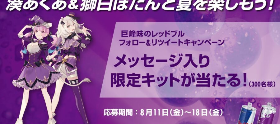 レッドブル・ジャパン株式会社 レッドブル・ジャパン株式会社は、⼈気⼥性 Vtuber グループ「ホロライブ」所属の「湊 あくあ」および「獅⽩ぼたん」との夏の特別コラボキャンペーンを W 開催します。8⽉11⽇(⾦)からは…