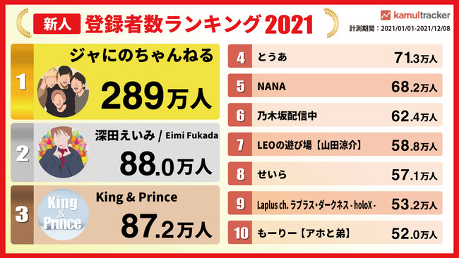 株式会社エビリー 国内最大級の動画SNSデータ分析ツール「kamui tracker」を運営する株式会社エビリー(本社:東京都渋谷区、代表取締役社長:中川恵介)は、2021年の新人YouTuberランキングトップ10(登…