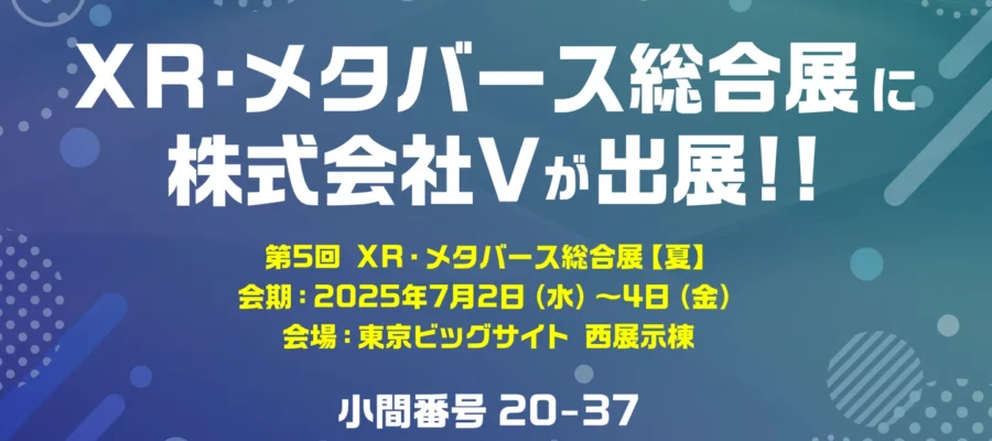 株式会社V 株式会社V(本社:東京都品川区、代表取締役兼CEO:藤原光汰、以下 V)は、2025年7月2日(水)から4日(金)まで東京ビッグサイトで開催される「XR・メタバース総合展」にて、ブース出展いたします。 本展示…