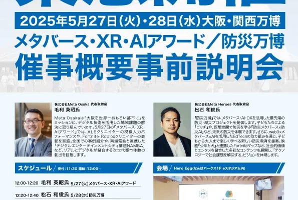 株式会社Meta Heroes 株式会社Meta Heroes(本社:大阪市、代表取締役:松石和俊、以下「当社」)は、2025年5月28日(火)に大阪・関西万博「EXPOホール」で開催される一般催事「防災万博」にて、17…
