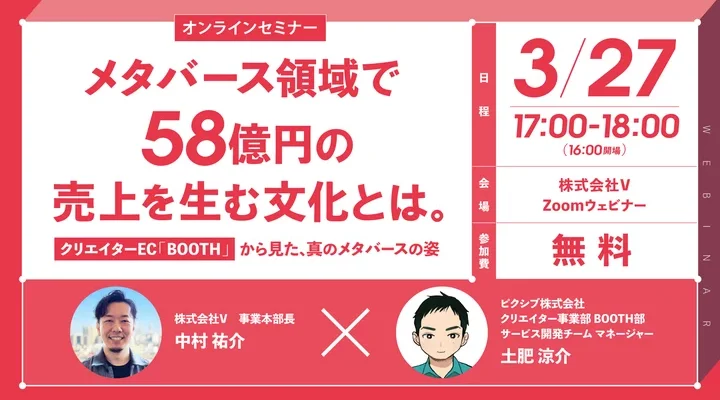 株式会社V 株式会社V(本社:東京都品川区、代表取締役兼CEO:藤原光汰、以下 V)は、2025年3月27日(木)17:00時より、オンラインセミナー「メタバース領域で58億円の売上を生む文化とは。クリエイターEC「BO…