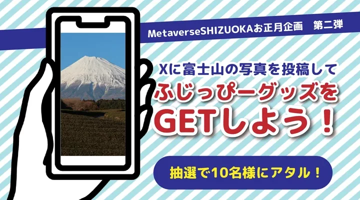 静岡県 ●MetaverseSHIZUOKAお正月企画 第二弾 静岡県【公式】X(エックス)に富士山の写真を投稿して、ふじっぴーグッズをゲット! みんなで富士山の写真を投稿し、「MetaverseSHIZUOKA」を盛り…