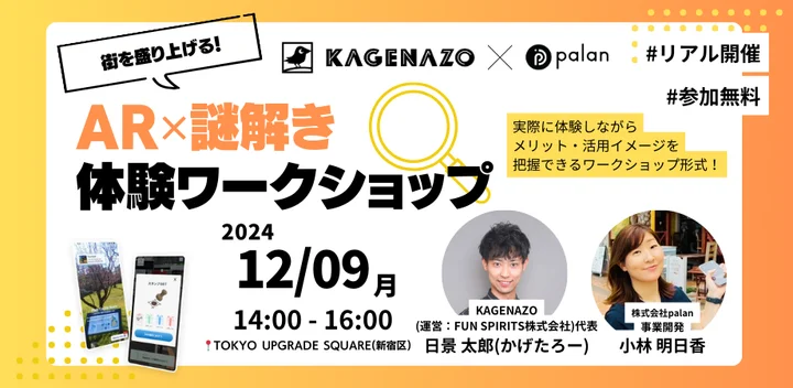 株式会社palan WebAR作成サービス「palanAR」を提供する株式会社palan (本社:東京都渋谷区、代表取締役:齋藤 瑛史)は、「謎解き×地域活性」をコンセプトに、日本中の地域に謎解きを仕掛けるクリエイティブ…
