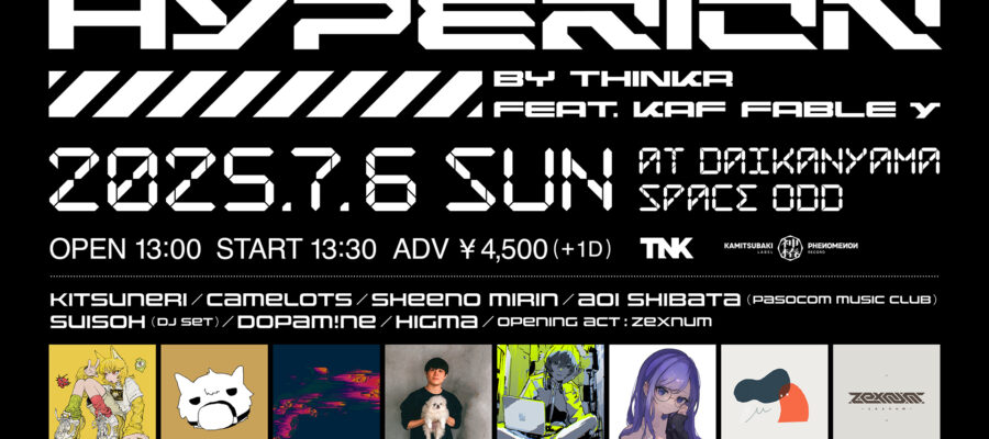 THINKR/KAMITSUBAKI STUDIOによる新たなイベント 「HYPERION BY THINKR」が、7月6日に代官山Space Oddにて開催されることが発表された。 第一弾フィーチャーアーティストにバー…