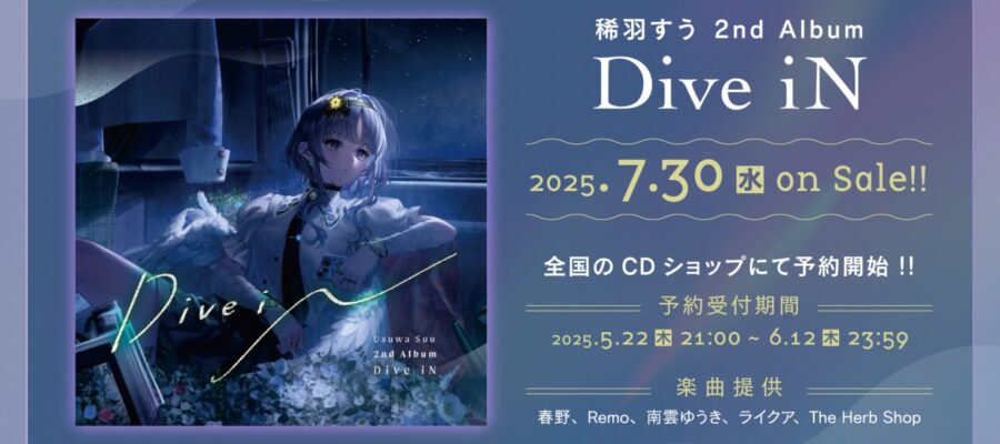 VTuber事務所「Re:AcT」に所属する稀羽(うすわ)すうが、2ndアルバム『Dive iN』を2025年7月30日にリリースし、10月4日にセカンドワンマンライブを開催することを発表した。 2024年5月4日に開催…