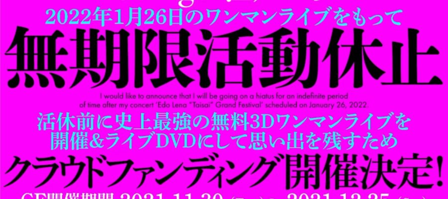 バーチャルシンガーの江戸レナさんは、11月22日にVR ENTASで開催したベストアルバム「PURPLE」リリースパーティーの中で、2022年1月26日に開催予定のワンマンライブ「江戸レナ大祭」をもって無期限活動休止に入…
