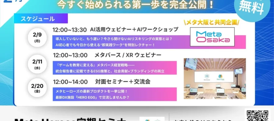 株式会社Meta Heroes 株式会社Meta Heroes(本社所在地:大阪府大阪市、代表取締役:松石和俊、以下「当社」)は、2026年2月、企業が次世代を生き抜くための「AI活用」「メタバース/XR戦略」をテーマに…