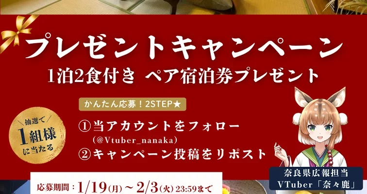 奈良県 奈良県では、県広報担当VTuber「奈々鹿(ななか)」の公式X(旧Twitter)アカウントを活用し、SNS連動型のプレゼント企画「奈々鹿から皆さまへ!奈良の魅力をおすそわけキャンペーン!」を実施しています。 本…