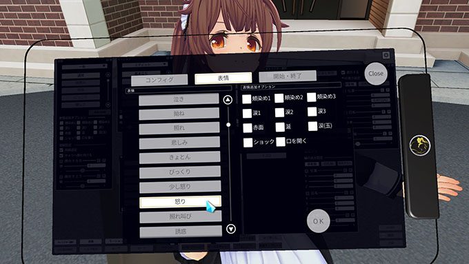 撮影機能としては、仮想カメラは自撮り棒で移動可能で、タイマー機能も備えている。キャラクターの表情は、事前に割り当てた上で手元のコントローラーのスティックやパッドで指示可能だ。リップシンクは、VRゴーグルや汎用のマイクの音を拾って、自動で口を開閉してくれる。